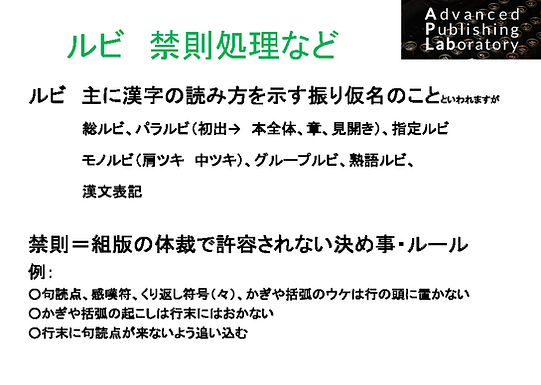 話は出版において重要な日本語のルールについてに移り、ルビや禁則処理といったルールについて紹介がされた。同じ感じでも複数の読み方をする日本語で、あらゆる漢字にルビを振る難しさ、そして場合によって使い分けられるルビの種類の話、さらには出版社、印刷会社がこのような日本語のルールにきちんと即した出版物にするために、DTPにおいてどのような工夫がされてきたのか、など、様々な領域に話は及んだ。また、Webサイトや電子書籍においては障害者の方々が問題なくコンテンツを利用できるようにする、アクセシビリティへの対応の話が紹介された。視覚障害者の方が読み上げソフトを使う際にどのようなニーズを持っているのか、どの場面で問題が発生するのか、アクセシビリティ対応で重要となる要素が紹介された。